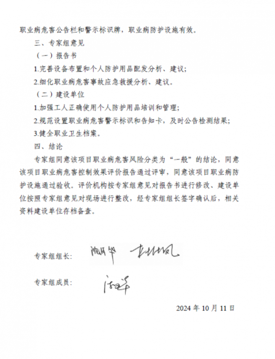 評價結(jié)論:根據(jù)對本項目現(xiàn)場調(diào)查、職業(yè)病危害因素檢測結(jié)果和項目相關(guān)資料的綜合分析,本項目當前(試運行階段)基本符合國家和地方對職業(yè)病防治方面法律、法規(guī)、標準的要求,本項目已具備職業(yè)病防護設施竣工驗收的條件。在生產(chǎn)狀況正常,職業(yè)病危害防護設施運行有效,工人佩戴合理有效的個體防護用品,其實際接觸的職業(yè)病危害因素的濃度/強度能夠控制在職業(yè)接觸限值內(nèi),且采取了控制效果評價報告所提對策措施和建議的情況下,符合國家和地方對職業(yè)病防治方面法律、法規(guī)、標準的要求。 建議: 1.1職業(yè)衛(wèi)生管理 1、該項目應定期委托有資質(zhì)的檢測機構(gòu)對工作場所內(nèi)職業(yè)病危害因素進行一次定期檢測,并對每次職業(yè)病危害因素檢測結(jié)果公示。 2、用人單位外委具有職業(yè)病危害的作業(yè)時,應書面告知給承包商工作場所存在的職業(yè)病危害以及相關(guān)要求,并采取措施達到防護條件,或配備個人職業(yè)病防護用品。 3、定期對在崗期間的勞動者進行職業(yè)衛(wèi)生培訓,根據(jù)實際情況制定培訓計劃,確定培訓周期。做好記錄及存檔工作。 4、本項目竣工驗收后,建設單位應按照本報告書識別的職業(yè)病危害因素進行申報。 5、該用人單位在作業(yè)場所設置了完善的警示標識,今后每半年至少應對其進行一次檢查,發(fā)現(xiàn)有破損、脫落、褪色、變形等不符合要求時,應按照《工作場所職業(yè)病危害警示標識》(GBZ158-2003)相關(guān)規(guī)定進行修整更換。 1.2個人防護用品 用人單位應當進一步完善個人防護用品的發(fā)放周期及使用監(jiān)管內(nèi)容,加強作業(yè)人員防護用品佩戴監(jiān)督,定期更換防護用品。 1.3職業(yè)健康監(jiān)護 該項目生產(chǎn)作業(yè)人員體檢因素還需進一步完善,將視屏作業(yè)納入職業(yè)健康體檢范疇。建議建設單位按照《職業(yè)健康監(jiān)護技術(shù)規(guī)范》(GBZ188-2014)相關(guān)規(guī)定,組織接觸職業(yè)病危害因素的作業(yè)人員到具有職業(yè)健康體檢資質(zhì)的醫(yī)院進行在崗期間職業(yè)健康體檢,對新進員工進行崗前體檢,對離崗人員進行離崗體檢。 建設單位應按《中華人民共和國職業(yè)病防治法》中華人民共和國主席令〔2018〕第24號和《職業(yè)健康監(jiān)護技術(shù)規(guī)范》(GBZ188-2014)相關(guān)規(guī)定全面履行職業(yè)健康監(jiān)護工作,對新進作業(yè)人員進行崗前體檢、并對離崗或調(diào)離作業(yè)人員進行離崗健康檢查,根據(jù)體檢結(jié)果對作業(yè)人員按照《職業(yè)病防治法》等法律法規(guī)進行合理處置。 1.4外包作業(yè)建議 1、督促外包單位安排本項目維護檢修人員完善職業(yè)健康體檢項目。 2、對外包單位維護檢修作業(yè)勞動過程中職業(yè)病防護設施使用情況和個人防護用品佩戴進行監(jiān)督。 1.5應急救援建議 該項目存在六氟化硫急性中毒、職業(yè)中暑、一氧化碳急性中毒,建議建設單位進行六氟化硫急性中毒、一氧化碳急性中毒、職業(yè)中暑應急演練并加強應急救援防護。