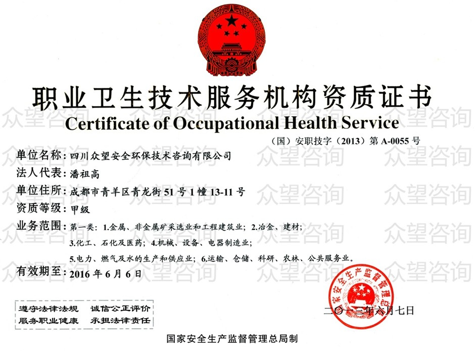 四川眾望自2010年取得職業(yè)衛(wèi)生技術(shù)服務(wù)機構(gòu)乙級資質(zhì)起即開始從事職業(yè)衛(wèi)生服務(wù)工作,于2013年6月7日取得職業(yè)衛(wèi)生技術(shù)服務(wù)機構(gòu)甲級資質(zhì)。在秉承“責(zé)任 規(guī)范 誠信 真相”的工作準(zhǔn)則下,眾望迄今已順利完成1300余項建設(shè)項目職業(yè)病危害因素日常檢測、職業(yè)病危害預(yù)評價、職業(yè)病危害控制效果評價及職業(yè)病危害現(xiàn)狀評價。